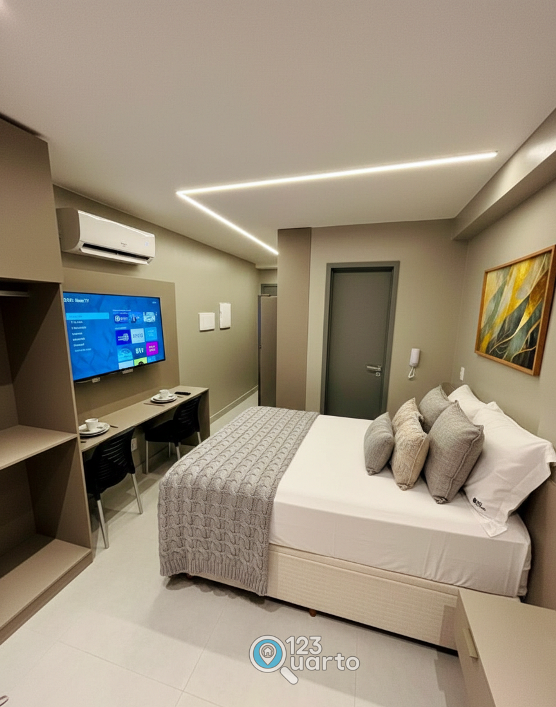 O espaço no Solaz Smart Living se destaca pelo design moderno, funcional e cuidadosamente planejado para proporcionar conforto e praticidade. A acomodação conta com móveis novos, ambiente climatizado, iluminação agradável e itens essenciais que garantem uma estadia tranquila. Cada detalhe foi pensado para oferecer bem-estar, desde a organização inteligente do ambiente até a qualidade dos equipamentos disponíveis.