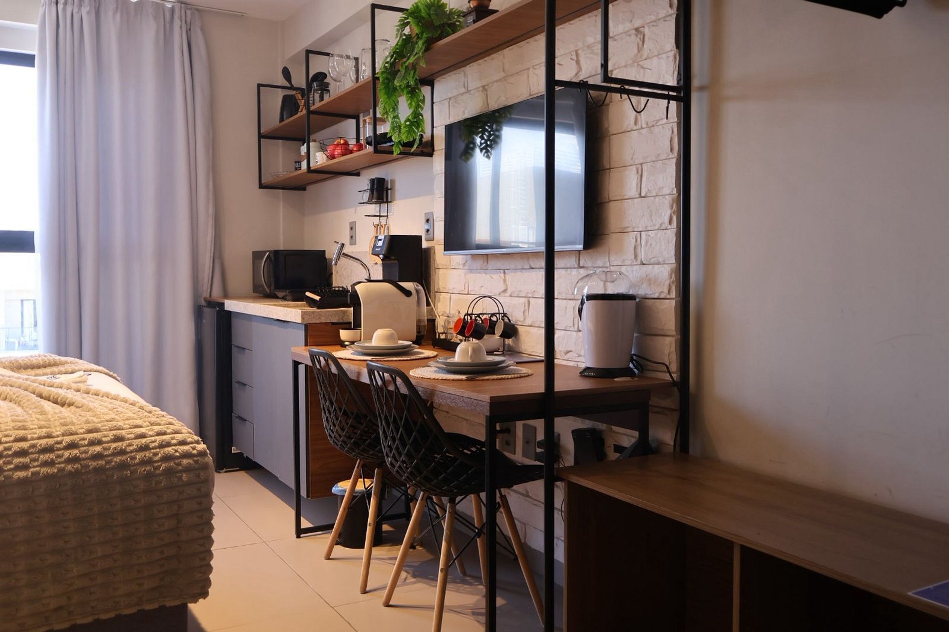 Os hóspedes terão acesso completo a todas as dependências do apartamento, incluindo a área privativa com cozinha compacta, banheiro, sala de estar e quarto. Além disso, poderão utilizar as áreas comuns do condomínio, como a piscina e a academia, durante o horário de funcionamento.